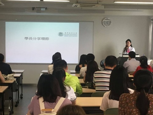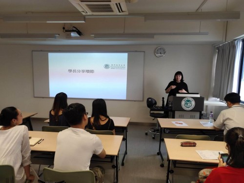之後,由學院的碩博課程主任,同時兼任學院科研機構,教育發展研究所副所長的李嵩義博士,向大家介紹學院歷史、定位、課程及目標等與學生息息相關的資訊,以及講解日常使用的教學系統和研究所的科研活動。最後,學院特地邀請了往屆教育學院學生,分享她們從新生的學習階段至進行研究的經驗,以及畢業後仍需留意地方。