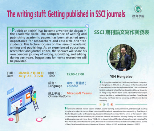 2020年7月28日下午,澳門城市大學教育學院邀請了香港中文大學教育學院課程與教學系的尹弘飆教授作了題為《SSCI期刊論文寫作與發表》的線上主題講座。本次講座由彭俊博士主持,參加本次講座的還有我院博士研究生和碩士研究生等。