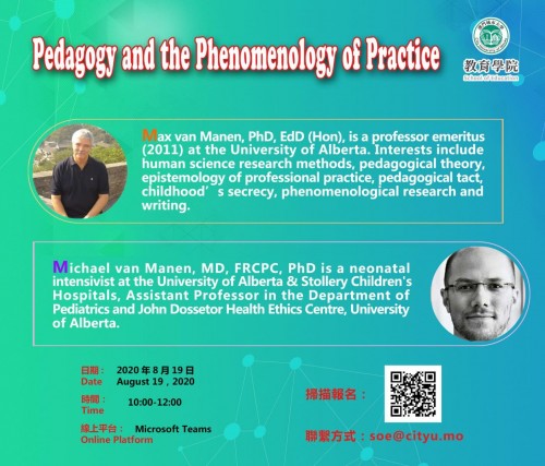 2020年8月19日上午,在颱風“海高斯”登陸澳門特別行政區與廣東省之際,澳門城市大學教育學院也掀起了一陣人文視域下的教育現象學之學術颶風,誠摯邀請了來自加拿大阿爾伯塔大學的“現象學教育學”大師馬克斯·范梅南教授與邁克爾·范梅南助理教授作了題為《教育學與實踐現象學》的線上主題講座。本次講座由教育現象學知名專家、澳門城市大學李樹英協理副校長兼教育學院院長主持並作翻譯,參與本次講座的還有我院的博碩士研究生,以及來自世界各地的眾多教育學界專家學者。