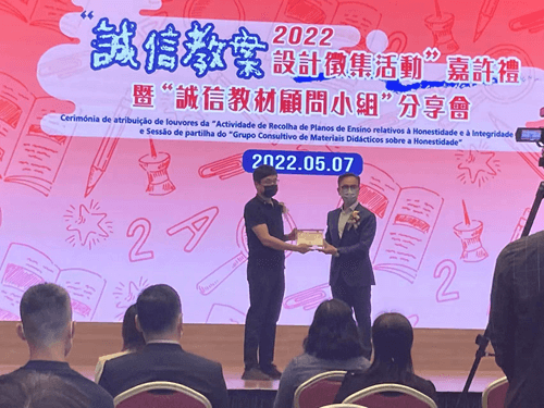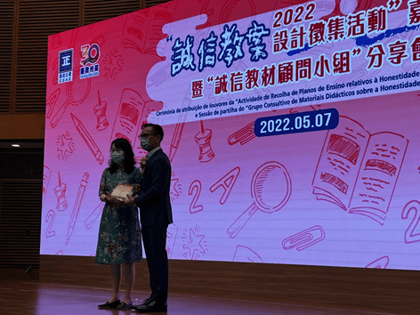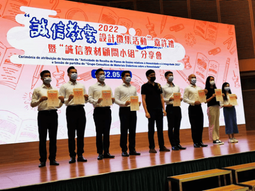 澳門城市大學教育學院一直鼓勵廣大師生積極參與澳門本地中小學和政府部門組織的教育性社會活動,不遺餘力地為本澳社會的教育文化發展提供自己的一份力量。2022年5月7日,由澳門廉政公署舉辦的誠信教案設計徵集活動二○二二嘉許禮暨誠信教材顧問小組分享會在澳門科學館會議中心順利召開並圓滿結束。我院金立賢院長和彭俊課程主任應邀作爲頒獎嘉賓全程參與了本次嘉許禮。